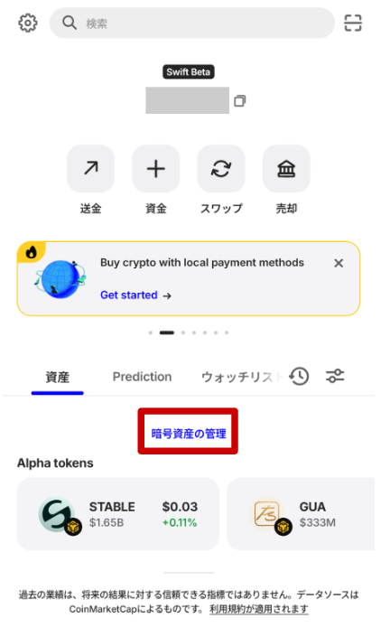 トラストウォレットを開き、「暗号資産の管理」を選択