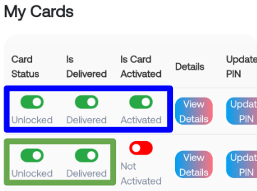 バーチャルカードはUnlocked、Deliveredが全てがオン(緑)になっていることを確認しましょう。