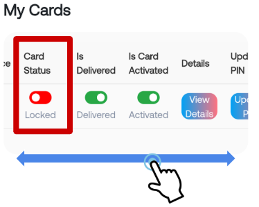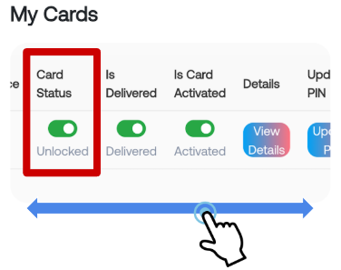 カードの紛失や再発行などでカードをロックしたい場合は緑色のボタンをタップしてください、カードをロックすることができます。